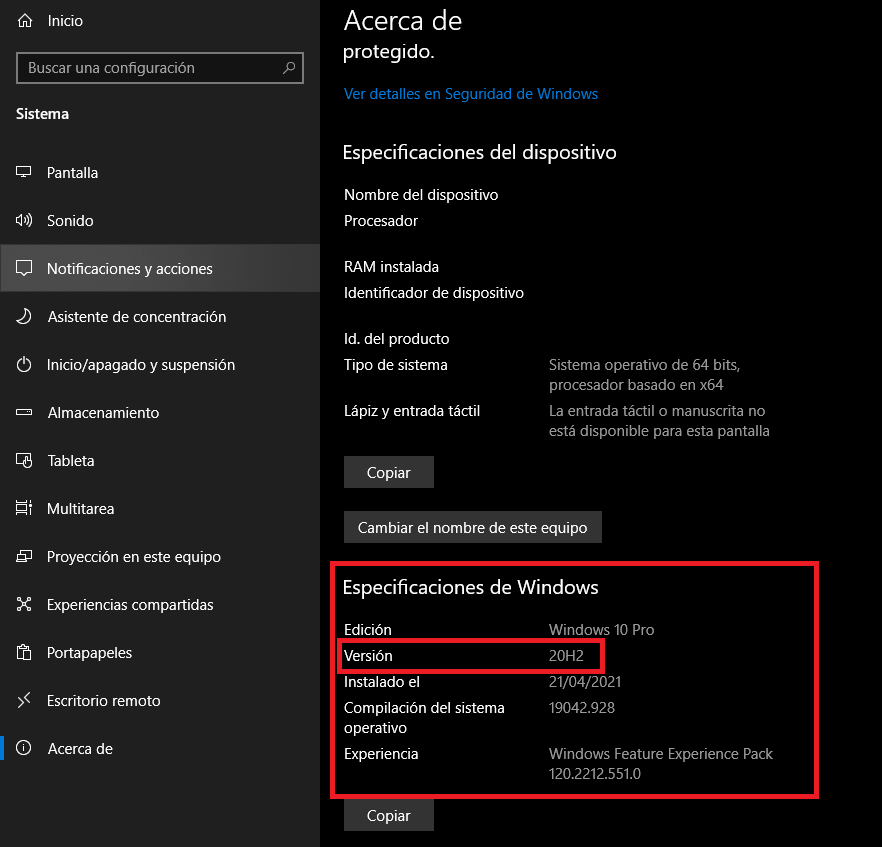 En este caso, la versión instalada es la 20H2, pero existen multitud de versiones de Windows 10.